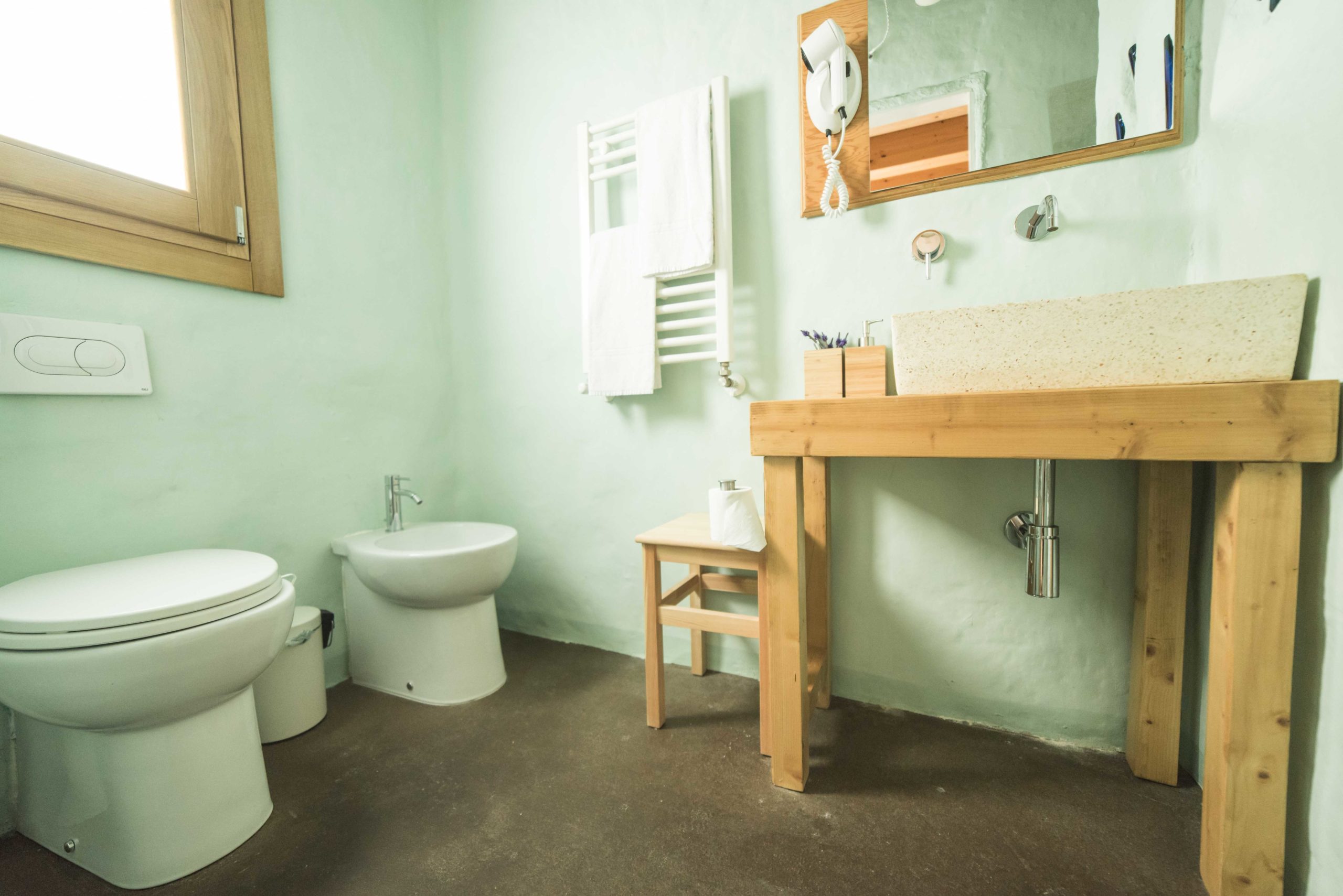 Nella casa di paglia bisogna dormirci per capire la qualità di confort che si vive, che si respira. Dalla parete in paglia sono ricavate delle nicchie dal design morbido e primitivo. I comodini sono ottenuti dall'unione di due oggetti: due cassette di un pittore anni '60 comprate al rigattiere e i piedi di due vecchi mobili. Le bajoux sono un hand-made dal brand Testaricippu. La specchiera con tavolino mi hanno fatto capolino al mercatino dell'usato mentre pensavo a questa stanza. In bagno spiccano gli inserti di Absolut vodka nella parete della doccia. Le linee morbide, creando degli intriganti giochi di luce-ombra, colmano l'aria di calde e sensuali vibrazioni.